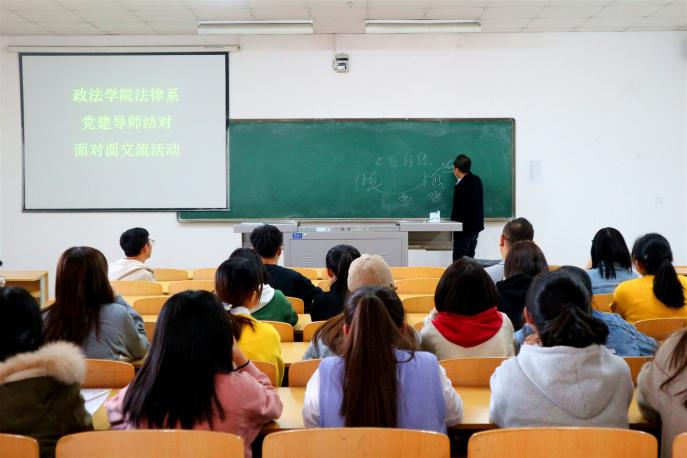 10月30日,法律系开展党建导师制师生见面活动,胡世恩副经理、系主任张弛和戴新毅、张驰、左海军、何磊、段向坤、滕明荣、张存明、王澍宜、江兆涛、朱爱农、杨国举、朱蓓予、许宝贵、卢烨、王丽婷、刘淑媛、马卫军、曹慈义、白利萍等教师党员分别在文荟103、105、109、111四个教室与自己所联系的党员员工和2019级新生相互见面,就如何充实老员工活学习、快速适应法学专业学习等问题与员工党员和2019级新生开展指导交流。各位党员教师对2019级新生的到来表示欢迎;随后,对热点社会现象法律知识、如何学好专业知识、如何更好地规划人生等问题作了详尽解答,并对同学们提出了殷切期望。