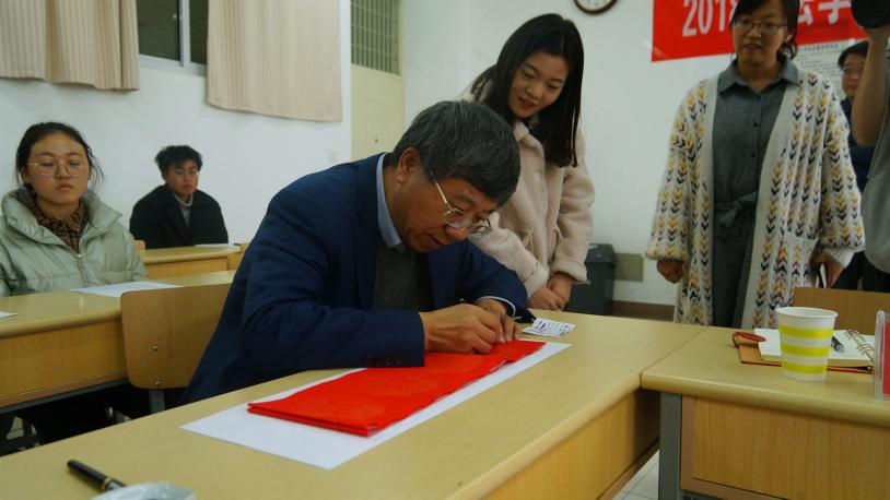 班会结束后,郎伟为2018级法学1班题写了“浩然明礼 俨然肯学”班训,并与大家合影留念。