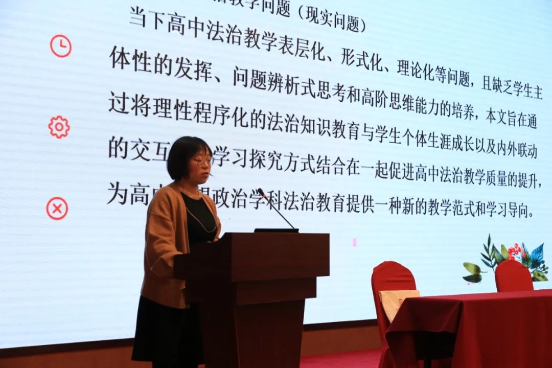 盐池高级中学田玲老师就《基于CIP生涯理论的高中法治教育探微——以高中政治教学为例》进行发言。依托生涯教育CIP信息加工理论与高中法治教育相结合,剖析了高中思政法治教学中的理论知识学习,法治践行能力提升以及法治理念价值引领的教学内容设计与模式,对提高员工对现实法治问题的抉择和解决能力具有启发意义。