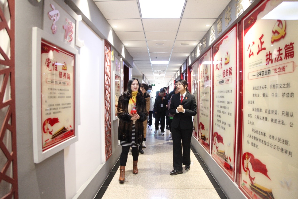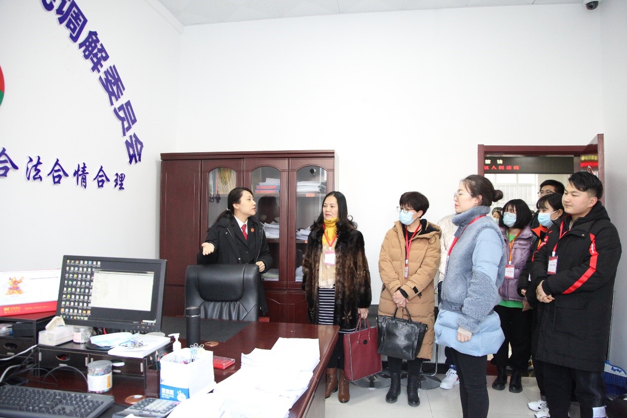 首先在金凤区法院综合办公室王冰副主任的引导下,体育平台官网师生来到诉讼服务大厅,详细了解了金凤法院推动“两个一站式”建设的基本情况和改革成果。诉讼服务中心多元化的纠纷调解渠道、不断完善的软硬件设施和持续提升的服务水平,得到了参观人员的一致肯定。
