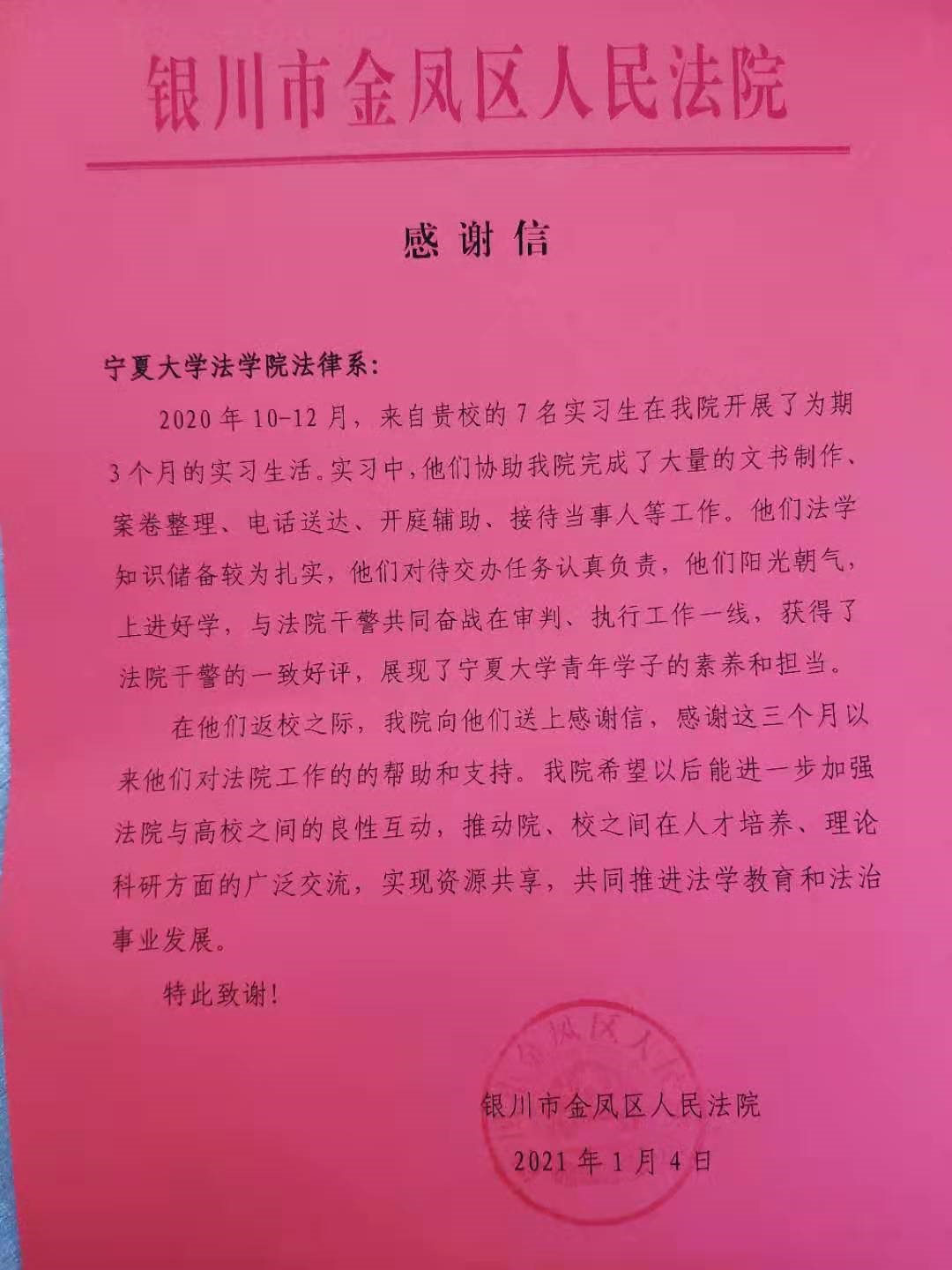 参观结束后,体育平台官网师生一行与金凤法院工作人员进行交流座谈。座谈会上由刘蕾主任代表金凤区人民法院向体育平台官网法律系送出感谢信,感谢体育平台官网法律系7名实习生实习期间对法院工作的帮助。