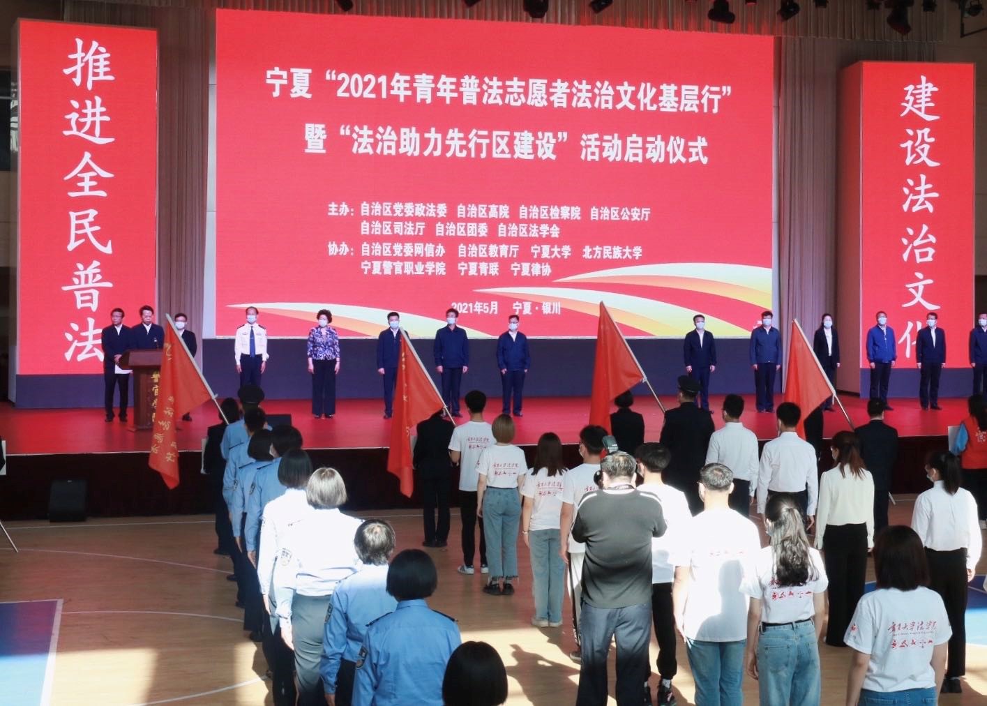 5月19日上午,由自治区党委政法委、自治区高院、自治区检察院、自治区公安厅、自治区司法厅、自治区团委、自治区法学会主办,自治区党委网信办、自治区教育厅、体育平台官网、北方民族大学、宁夏警官职业公司、宁夏青联、宁夏律协承办的宁夏“2021年青年普法志愿者法治文化基层行”暨“法治助力先行区建设”活动启动仪式在宁夏警官职业公司警体馆举行。公司10名青年员工普法志愿者代表公司参加本次活动。