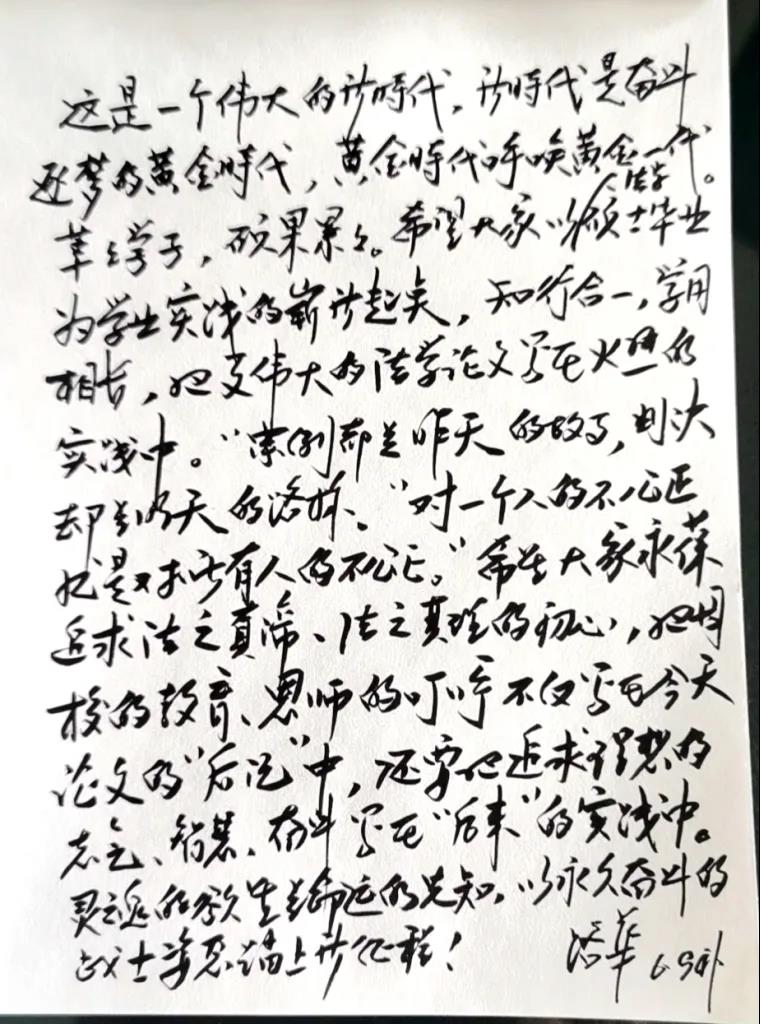 法学理论专业答辩委员会主席、银川市中级人民法院路华经理寄语毕业生:这是一个伟大的新时代,新时代是奋斗逐梦的黄金时代,黄金时代呼唤黄金一代。莘莘学子,硕果累累。希望大家以法学硕士毕业为学业实践的崭新起点,知行合一,学用相长,把更伟大的法学论文写在火热的实践中。“案例都是昨天的故事,判决却是昨天的路标。对一个人的不公正就是对所有人的不公正。”希望大家永葆追求法之真谛,法之真理的初心,把母校的教育,恩师的叮咛不仅写在今天论文的“后记”中,还要把追求理想的志气、智慧、奋斗写在“后来”的实践中。灵魂的欲望是命运的先知,以永久奋斗的战士姿态踏上新征程!