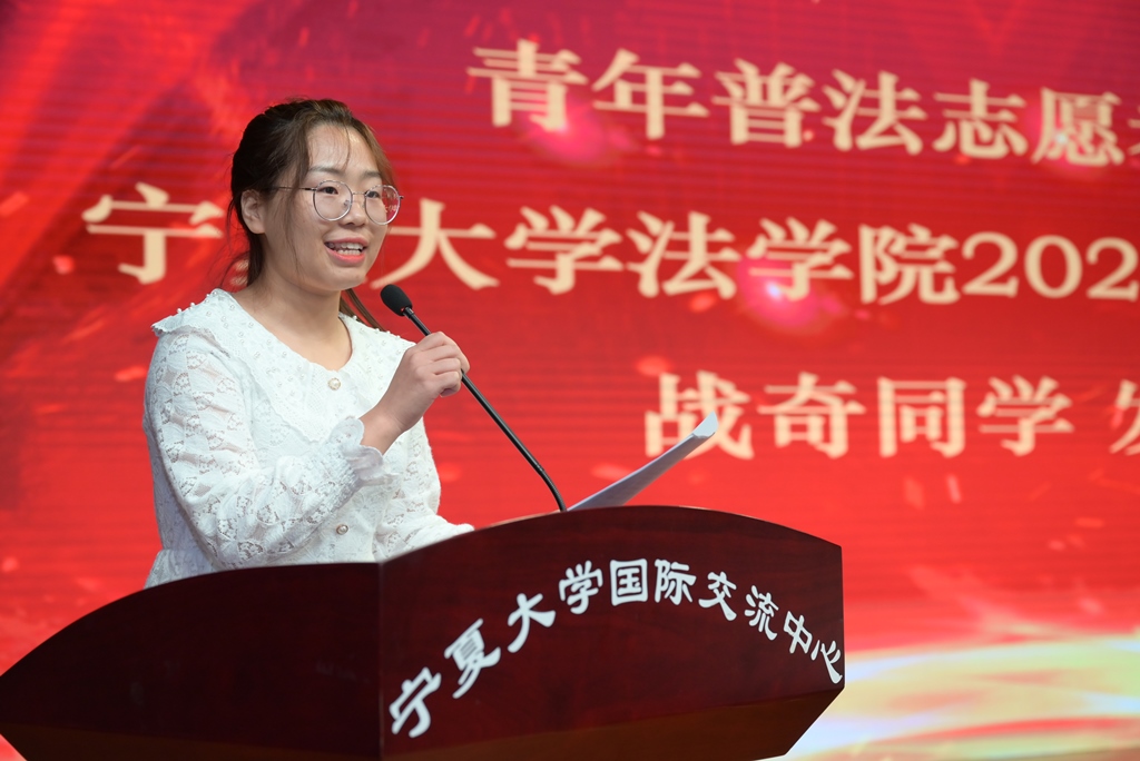 自治区民政厅副厅长张隽华为体育平台官网青年普法志愿者授旗,2020级法学专业本科生战奇同学代表普法志愿者发言。体育平台官网曲正教授为在场师生带来了一场精彩的《中华人民共和国未成年人保护法解读》专题学习讲座。