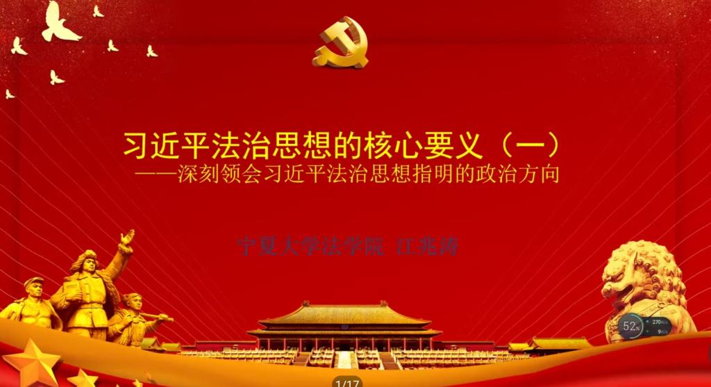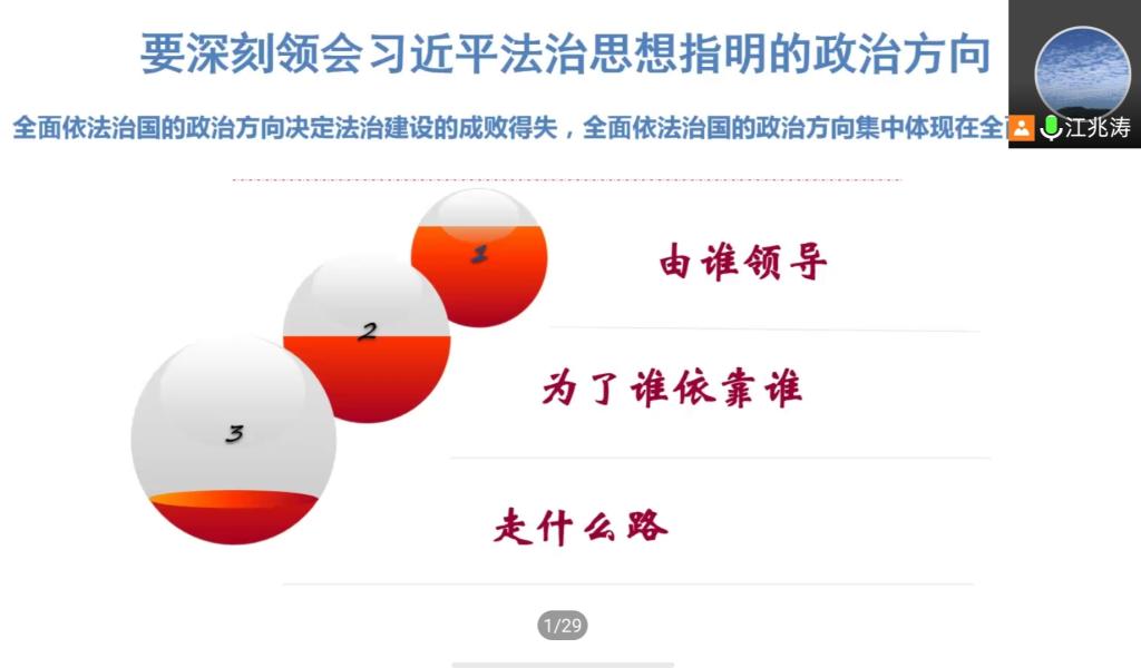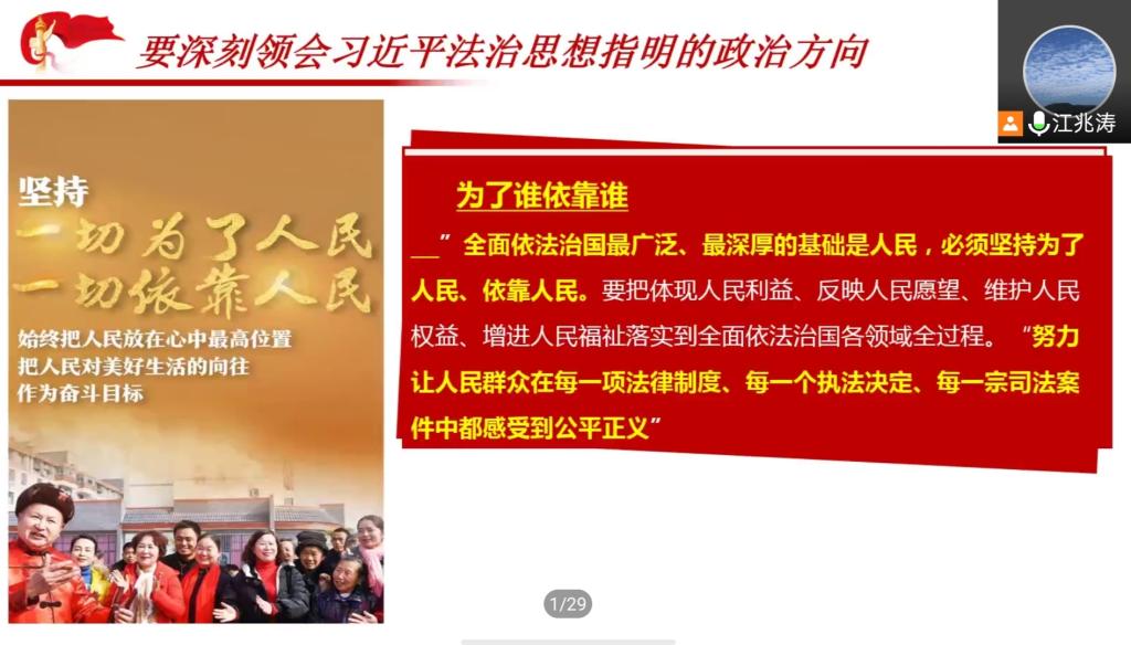 为深入贯彻落实习近平法治思想,全面做好法治人才培养工作,提高法学专业本科生思想政治素质和法治素质,体育平台官网于11月10日下午组织开展《习近平法治思想概论》第三讲“习近平法治思想核心要义(第一部分)”主题线上讲座。本次讲座由江兆涛老师主讲,体育平台官网副经理胡世恩、法律系主任朱蓓予和部分法律系教师出席,二百多名法学专业本科生、研究生参加学习。