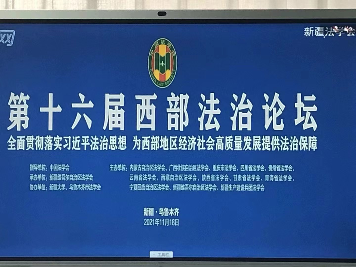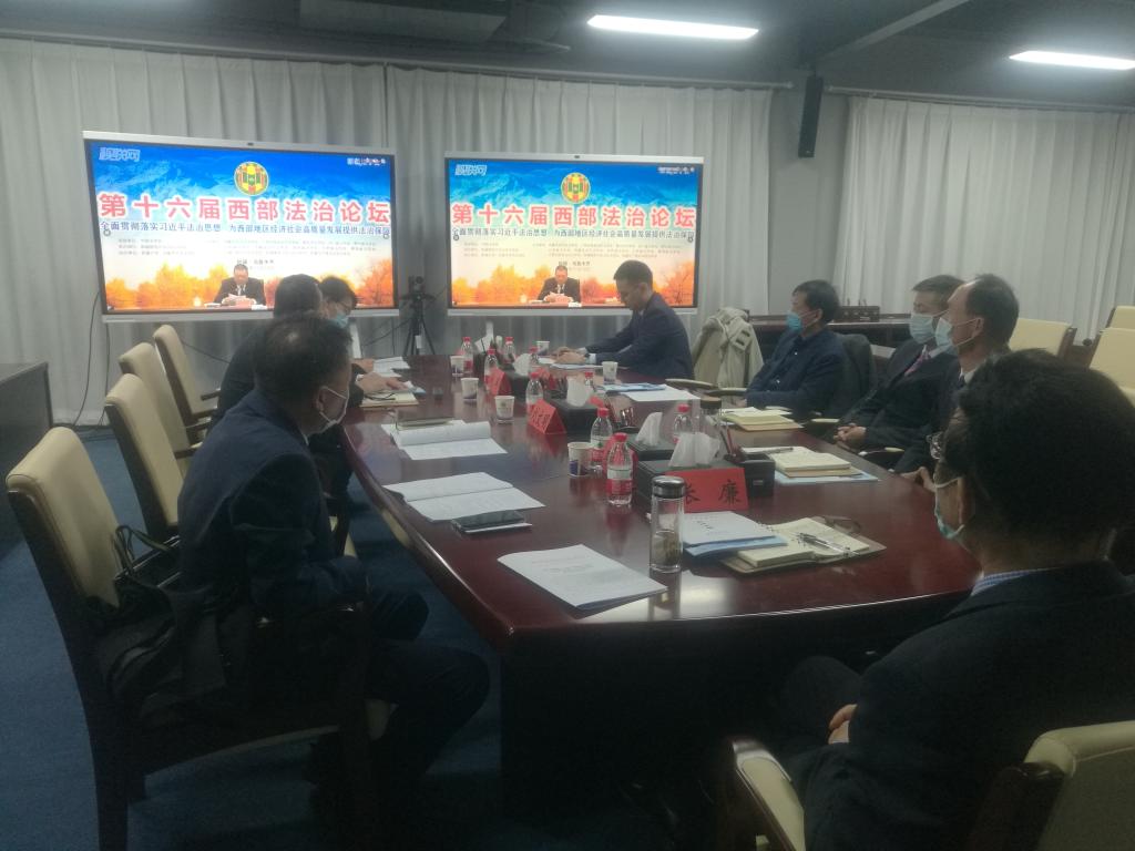 2021年11月18日,以“全面贯彻落实习近平法治思想为西部地区经济社会高质量发展提供法治保障”为主题的第十六届“中国·西部法治论坛”在新疆乌鲁木齐市举办。来自西部12个省区市和新疆生产建设兵团法学会负责人、法学法律界专家学者、获奖单位和作者代表近300人,通过“线上+线下”形式进行研讨交流。中国法学会党组成员、副会长张苏军线上出席论坛并讲话,新疆维吾尔自治区党委常委、政法委书记、法学会副会长王明山在主会场致辞。自治区法学会党组书记、常务副会长张廉和我区部分获奖论文作者在宁夏分会场参加论坛。