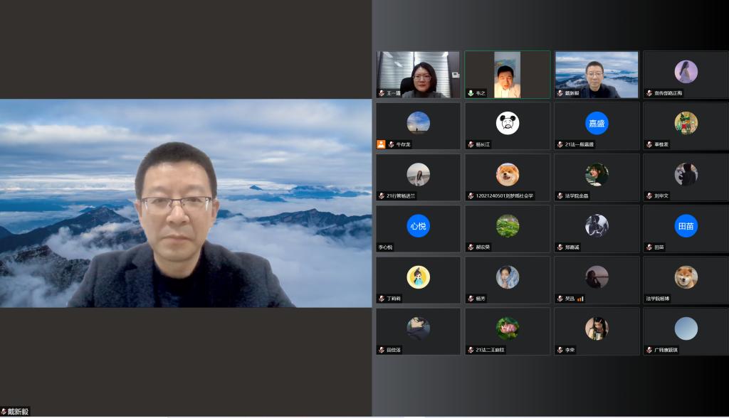 本次学术活动由公司法律系教师王一璠主持,法学专业负责人、法学一级硕士点负责人戴新毅教授作为与谈人参会讨论。本次活动反响热烈,不仅吸引了公司广大师生,还有中国政法大学、北京林业大学、河北大学、内蒙古大学、广西师范大学等兄弟院校的教师、硕博士生也参会讨论,