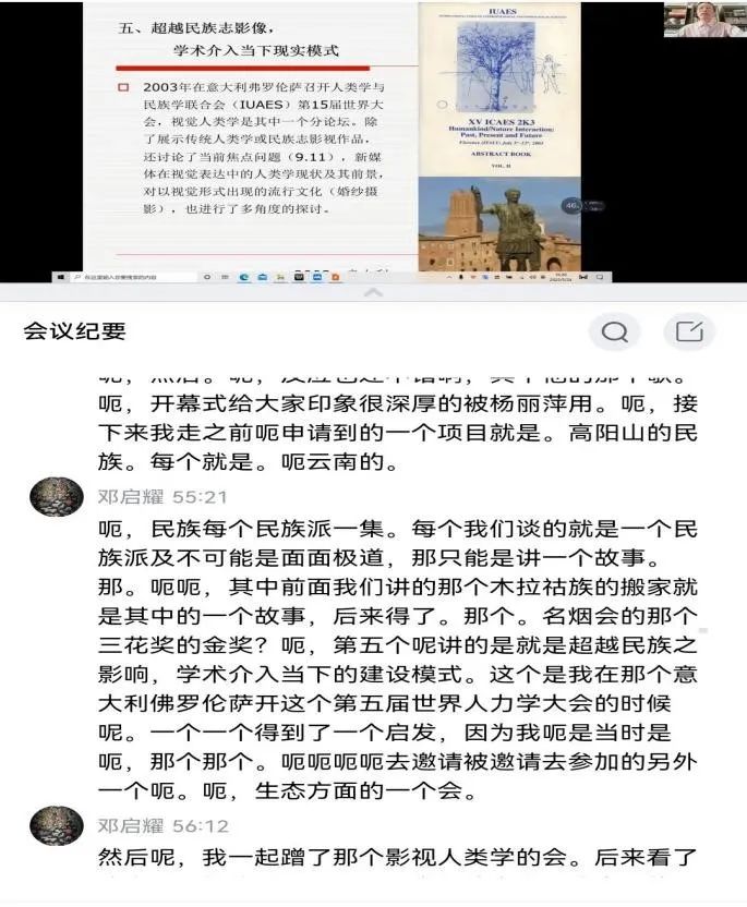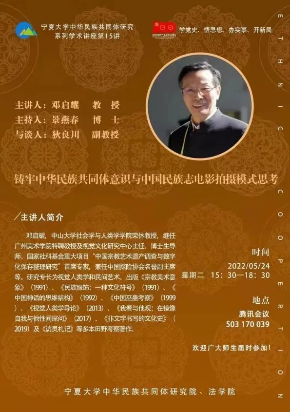 5月24日下午,公司“2022年度铸牢中华民族共同体意识教育项目——铸牢中华民族共同体意识学术讲座(研讨会)之三”在线上举行,本期讲座特邀中山大学社会学与人类学公司荣休教授、广州美术公司特聘教授及视觉文化研究中心主任,博士生导师邓启耀为主讲人,主题为“铸牢中华民族共同体意识与中国民族志电影拍摄模式思考”。此次讲座由民族学专业教师景燕春主持,狄良川副教授为与谈人,民族学学科的师生聆听学习。