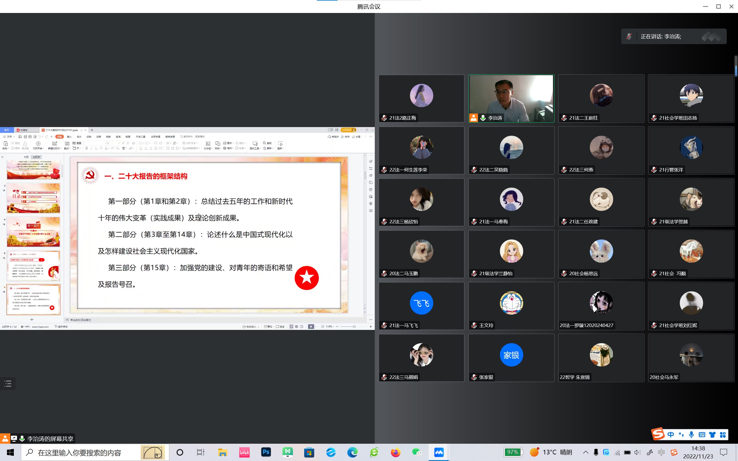 李治涛以“九个数字”为同学们深入浅出地讲解了党的二十大的内容。讲解清晰全面、生动鲜活,激发了与会同学的强烈共鸣。此外,他剖析了中国式现代化、马克思主义中国化时代化等重要命题,深刻阐述了“两个结合”的内在机理与逻辑,对“六个坚持”所体现的世界观方法论进行了系统解读,让同学们领悟到党的二十大报告的理论创新。