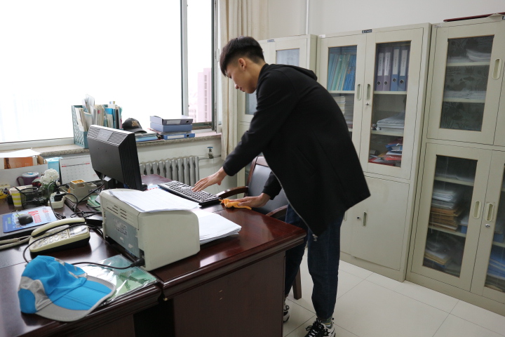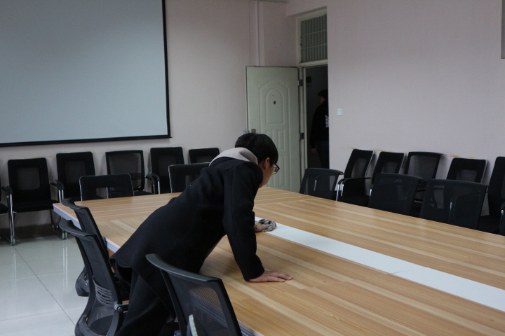 在志愿者服务部干事的细心策划与合理分工后,活动正式拉开帷幕。一部分志愿者进入公司各行政办公室打扫地板、办公桌桌面以及办公室的每个死角,希望通过此次行动能为老师们创造良好的办公环境;另一部分志愿者到公司会议室和模拟法庭进行黑板、桌椅、地面等清扫工作。在打扫卫生的过程中,志愿者们学着干、抢着干,一个个干劲十足、毫不懈怠,积极用实际行动诠释着“雷锋精神”。