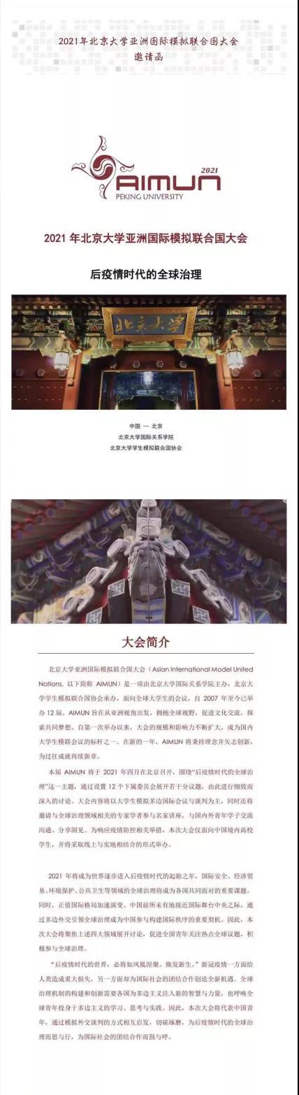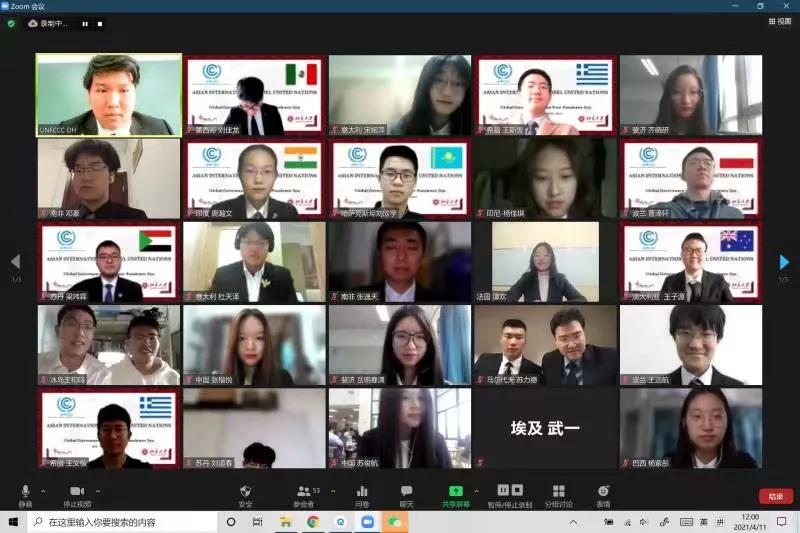 日前,由公司4名员工及国际教育公司2名员工组成的体育平台官网国际关系学会代表团,于线上参加了由北京大学国际关系公司主办的2021年北京大学亚洲国际模拟联合国大会。本届大会围绕“后疫情时代的全球治理”这一主题,旨在从亚洲视角出发,拥抱全球视野,促进文化交流,探索共同梦想。
