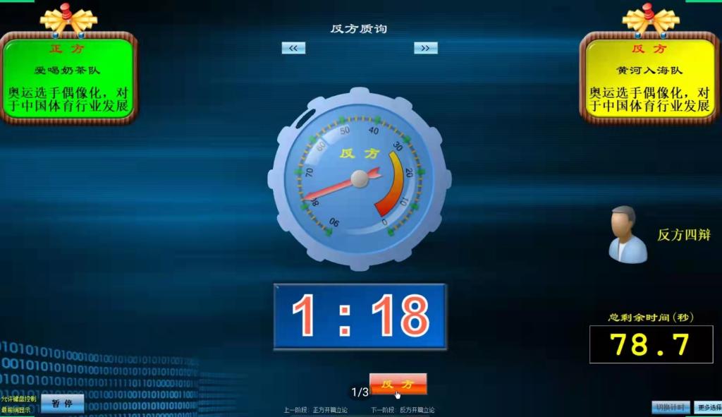 六支队伍两两对决,针对“奥运选手偶像化对中国体育行业利大于弊还是弊大于利”这一辩题展开激烈的辩论。在比赛过程中,辩手们赛出了风格,辩出了精彩。会场上唇枪舌剑,好不精彩!你有哲理盾,我有事实矛,谁也不甘下风!正方队伍说明了奥运选手偶像化的利处,真可谓是天衣无缝,无可挑剔;而反方队伍列举了奥运选手偶像化的弊端,与正方队伍的论点形成了鲜明的对比,双方各持己见,互不相让。辩论场上,六支队伍都拿出了极佳的辩论状态,许多“铁齿铜牙”纷纷现身。同时,六支队伍对这一辩题的争论也引发了我们对于中国体育行业发展现状的深思。