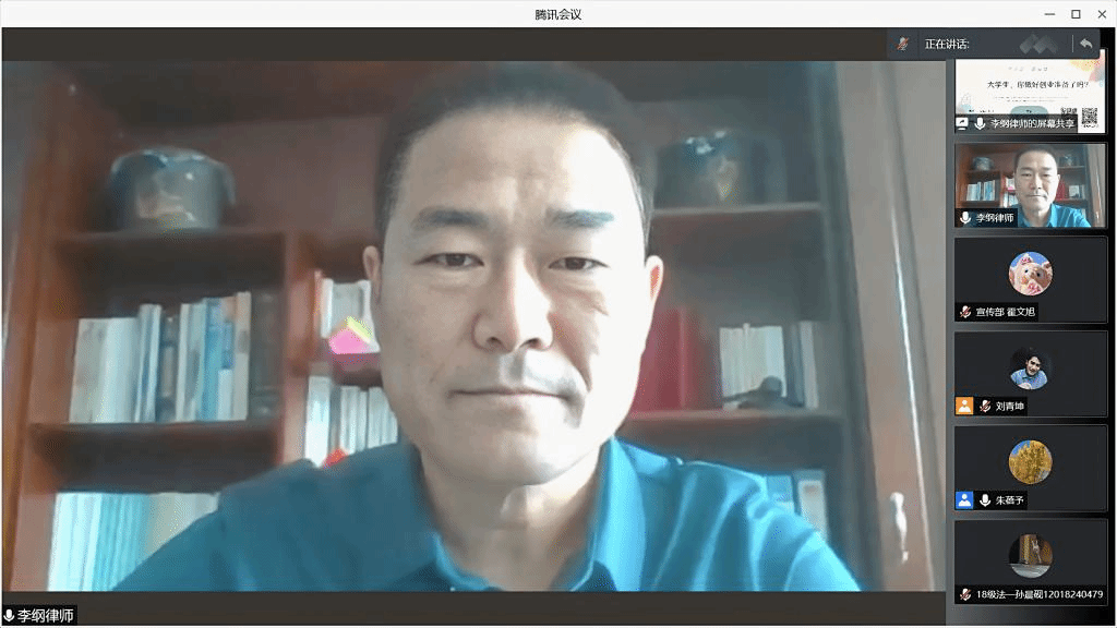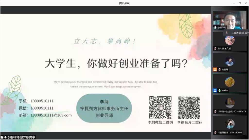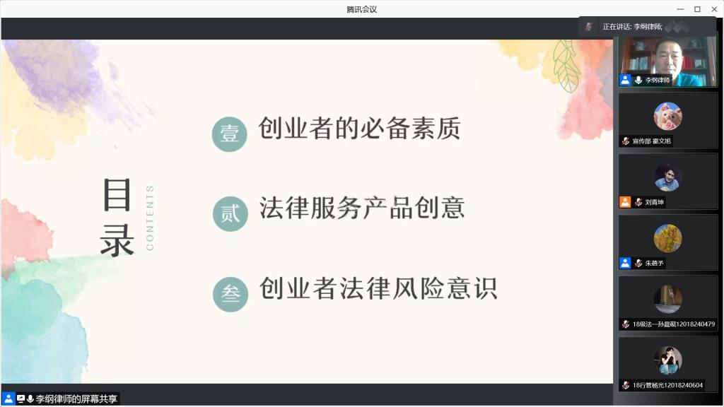 为深化高校素质教育,培养同学们的创新思维,帮助同学们挖掘创业潜能、掌握创业知识、实现创业梦想,11月20日下午,体育平台官网组织开展“老员工,你做好创业准备了吗?”主题线上讲座。本次讲座特邀宁夏朔方律师事务所主任、宁夏律师协会副秘书长李纲律师主讲,法律系主任朱蓓予及2018级全体本科生参加。