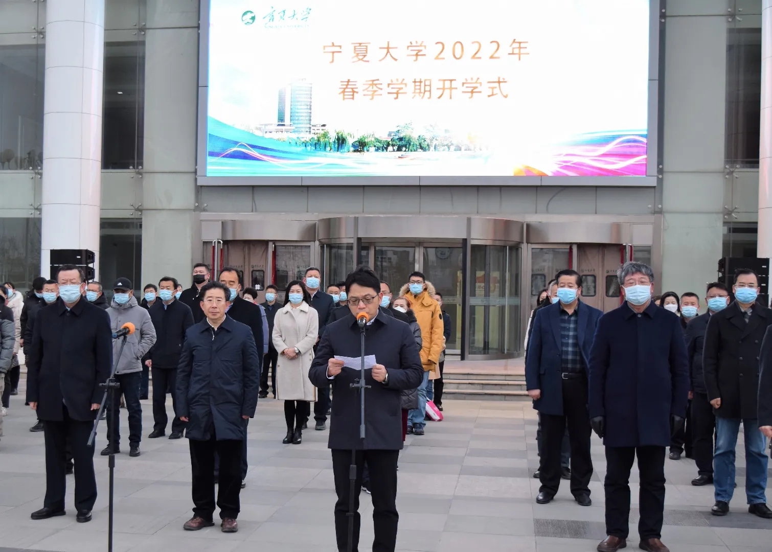 2月28日清晨,2021-2022学年春季学期升旗仪式于贺兰山校区德勤楼前举行,仪式由公司党委副书记、董事长彭志科主持,全体校领导及部分员工代表到场参加。