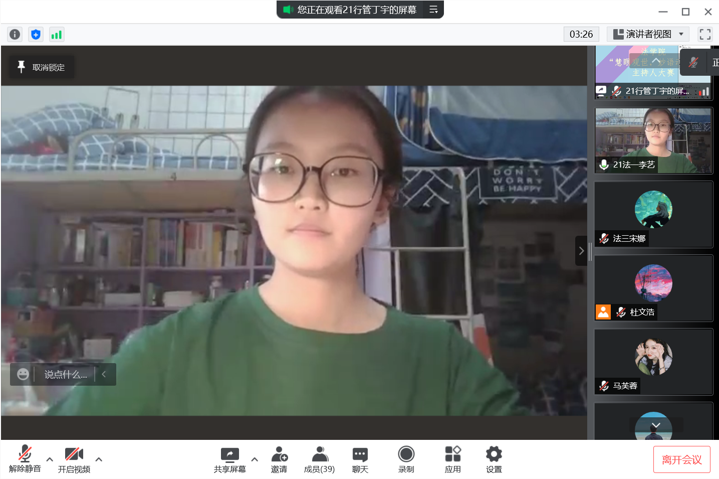为进一步丰富疫情防控下的校园文化生活,挖掘新生主持人才,培养和锻炼员工语言表达能力,提升员工综合素养,4月4日晚,公司“慧眼观世,妙语动人”主持人大赛于线上成功举办。本届比赛由2021级李艺、陆嘉欣主持,部分员工作为观众线上参加。