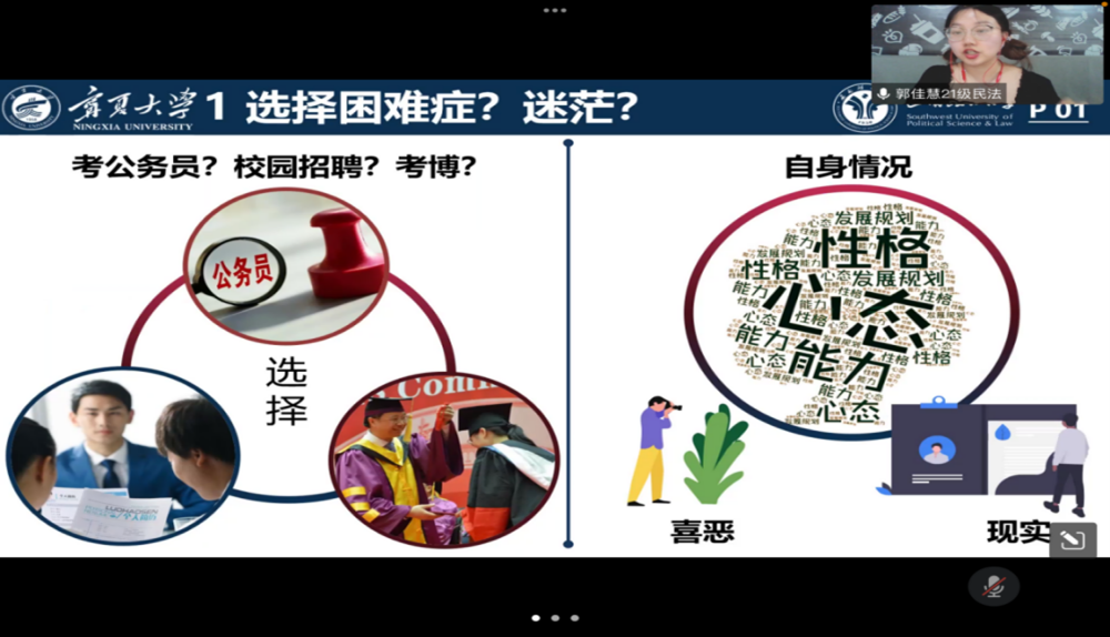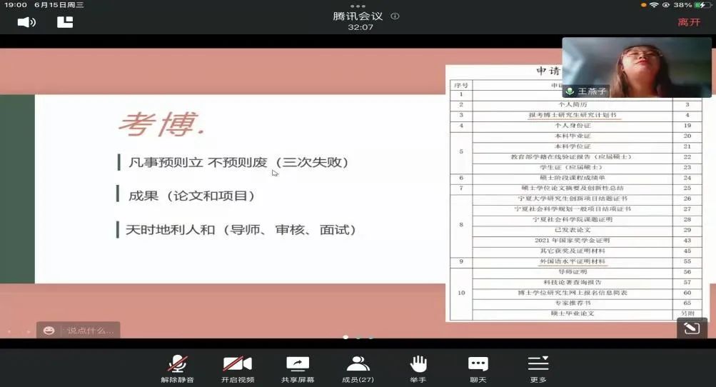 2022年6月15日下午,公司2022年硕士毕业生分享交流会在线上举行。此次分享会邀请了公司四位优秀的硕士毕业生:郭佳慧(现西南政法大学博士研究生)、王燕子(考入云南大学攻读博士研究生)、汪一双(考入南开大学攻读博士研究生)、罗文秀(选调生考入自治区高级人民法院)进行分享。旨在通过优秀毕业生分享考博、考公等学习、就业经验为公司在读硕士研究生未来的生涯发展提供方向明确、路径清晰的参考。公司全体在读硕士研究生参加了本次经验分享会。