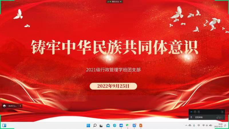 2022年9月是全区第39个民族团结进步月。为全面贯彻落实中央民工作会议精神和自治区第十三次党代会精神,引导广大团员青年进一步铸牢中华民族共同体意识,促进公司各民族师生交往交流交融,院属各团支部于9月25日晚开展“铸牢中华民族共同体意识”主题团日活动,本次活动采取腾讯会议的形式进行,由各班团支部书记主持。