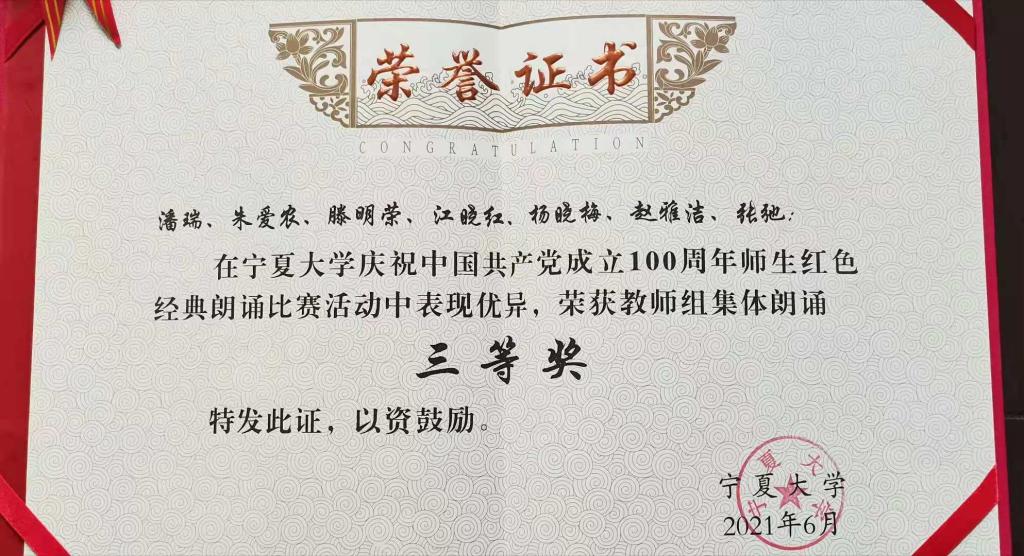为进一步引导师生在朗诵红色经典中学习党的百年光辉历史,铸牢中华民族共同体意识。6月8日下午,共青团体育平台官网委员会于国际交流中心举办了“感党恩·听党话·跟党走”红色经典朗诵展演暨颁奖典礼。体育平台官网获得优秀组织奖和教师集体三等奖。党委书记潘瑞等7名教师参加了展演。