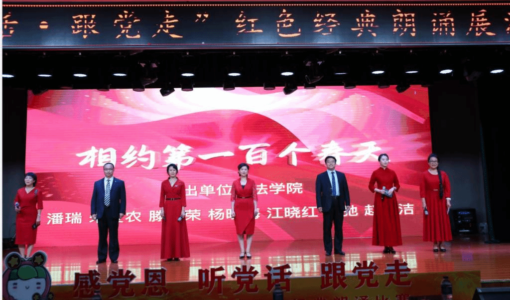 展演现场,《黄河》《黎明》……一首首激情澎湃的诗歌,是一场场声音的礼赞,师生饱含深情的朗诵让观众深切感受到中国共产党波澜壮阔的百年征程。公司代表队于第三篇章——天耀中华压轴出场,教师们用质朴的语言,真挚的感情朗诵了作品《相约在第一百个春天里》,他们以慷慨激昂的语调,深情款款的言语,热情讴歌党的丰功伟绩和共产党人永恒的精神追求、崇高的理想信念,倾注了对党和国家的热爱与感激。现场掌声阵阵、气氛热烈。