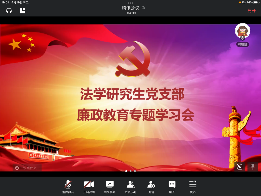 为加强支部同志党性教育,引导党员同志坚定理想信念,根据公司相关文件要求,法学研究生党支部于2022年4月19日,以线上形式开展“廉政警示教育月”系列活动之廉政教育专题学习会。