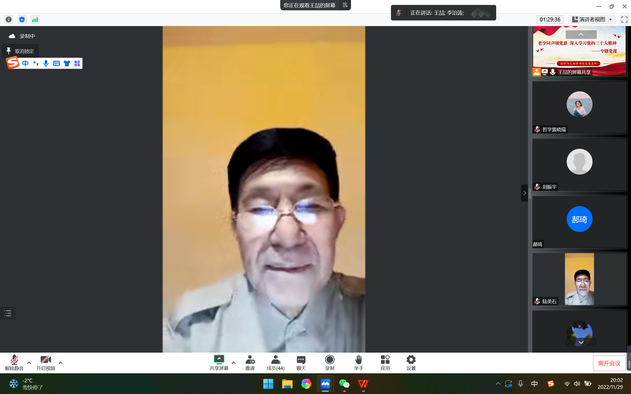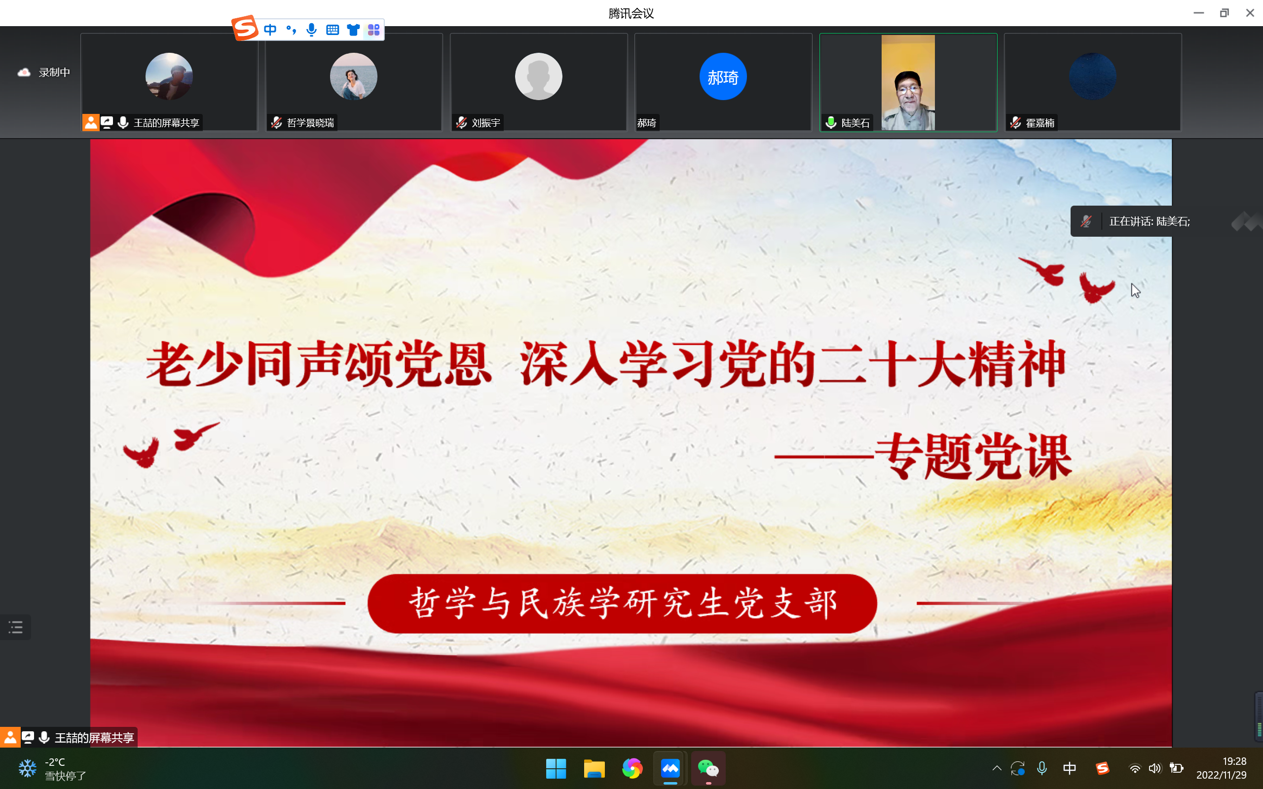 为进一步增强支部党员党性修养,深入学习党的二十大精神,11月29日晚7点,哲学与民族学研究生党支部以线上形式,召开“老少同声颂党恩,深入学习党的二十大精神”专题党课。公司党委书记李治涛,党委委员、副经理刘振宇,体育平台官网关工委副主任、关工委“五老”报告团团长陆美石应邀参加,支部全体党员、发展对象和入党积极分子共同学习。会议由支部组织委员王喆主持。