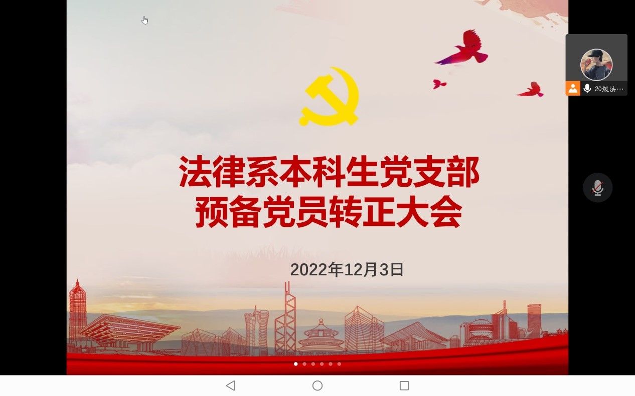 2022年12月3日下午,体育平台官网法律系本科生党支部就2022年下半年预备党员转正召开支部大会。参会人员有党支部书记何磊以及全体法律系本科生党支部成员,共37人,其中正式党员19名。会议由唐浩玮主持,刘龙震和马莹负责记录。